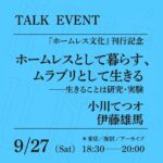 そして近年の小川さんは、境界にとどまって少し根を下ろす感じ、その場を育てる感じになっているのかな、と。そこに居ることが生活であり表現である、というような。いま、公園暮らし20年の記録をまとめた小川さんの『ホームレス文化』(8月刊行予定)を編集しながら、小川さんの「やり方」の深まりを感じています。